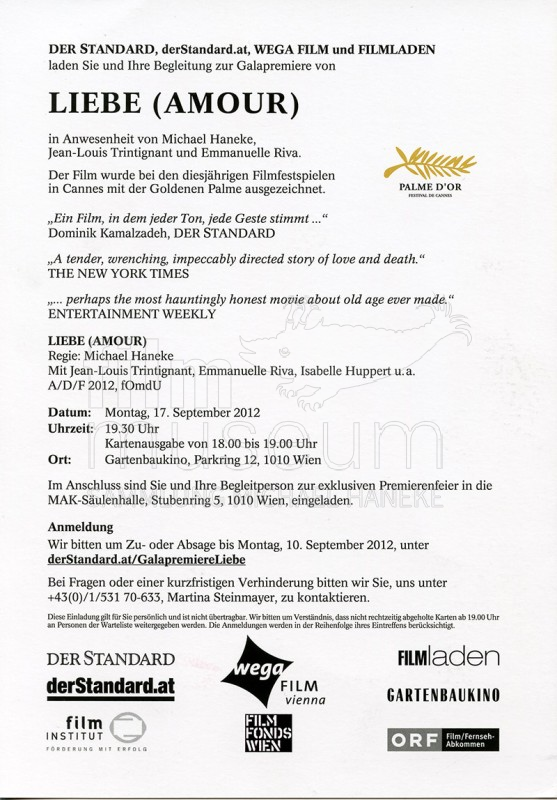 | Contains: | 1 Exemplar (dt.), Einladungskarte zur österreichischen Galapremiere von "Liebe" / "Amour" am 17. September 2012 im Gartenbaukino |