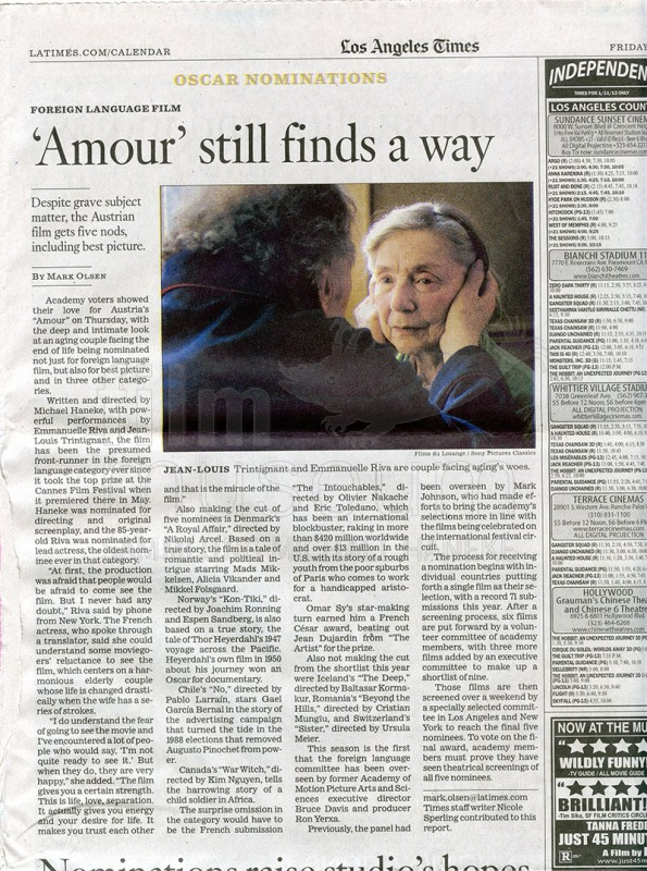 | Contains: | 4 lose Blätter (engl.): Titelblatt, auf dem die Regisseure der nominierten Filme abgedruckt sind (Schlagzeile "Academy doesn't follow the script"); Artikel über die Bekanntgabe der Nominierungen ("Oscar watchers didn't see these picks coming", S. 12, von Steven Zeitchik und Amy Kaufman); Artikel und Analysen der Oscar-Nominierten (u.a. "Amour still finds a way", S. 27, von Mark Olsen) |