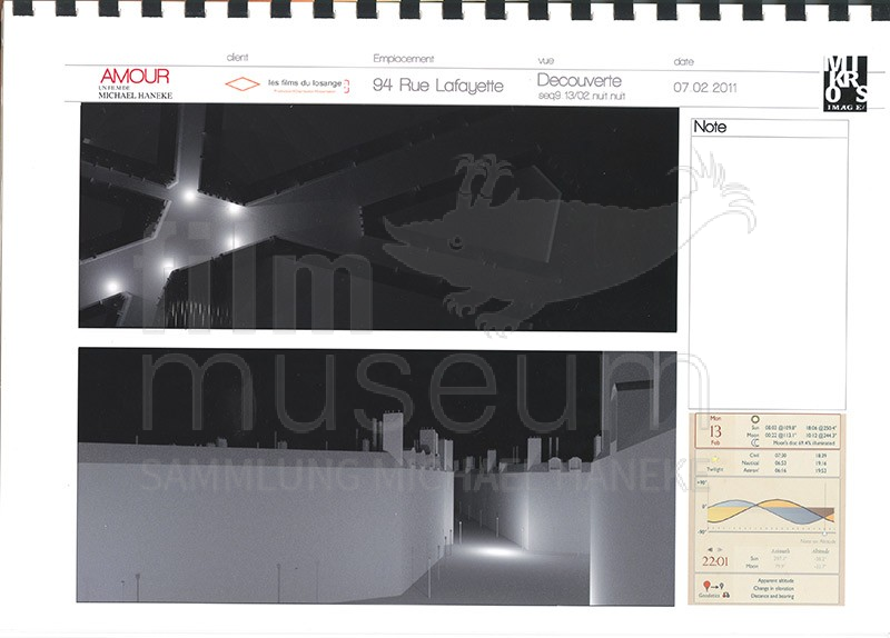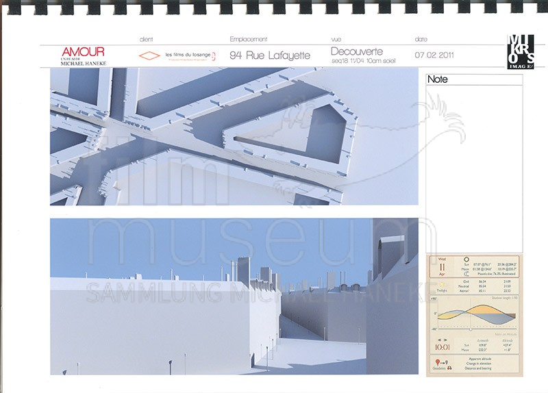 | Contains: | 1 Ringbuch (frz.), enthält 3D-Modelle und Berechnungen zu Licht- und Wetterverhältnissen der Filmwohnung. Hergestellt von der VFX-Firma Mikros Image |