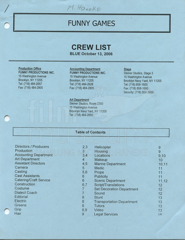 | Contains: | 7 geheftete Blätter: Crewliste der Produktion "Funny Games U.S.", Exemplar von Michael Haneke |