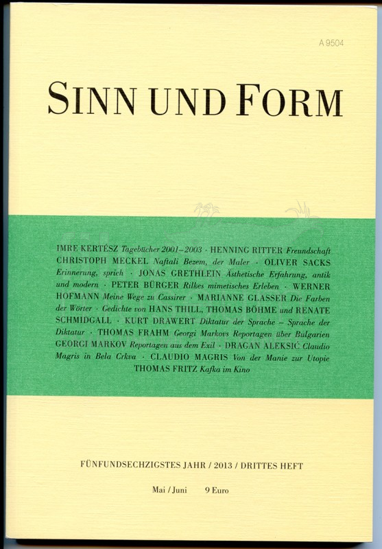 | Contains: | 1 Exemplar der zweimonatlich erscheinenden Zeitschrift "Sinn und Form": Essay über Hanekes Verfilmung von "Das Schloss" (S. 436-440) |