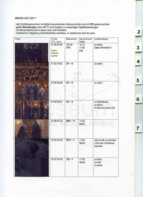 | Contains: | 1 Ringbuch (dt./frz.), enthält Hanekes Bild-für-Bild Anmerkungen zur Licht- und Farbbestimmung des Films. Beiliegend eine 5-seitige Liste ("Etalonnage - Remarques de Michael, 13/10/2011") mit Anmerkungen auf Französisch |
