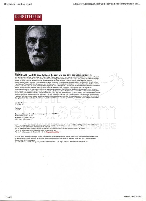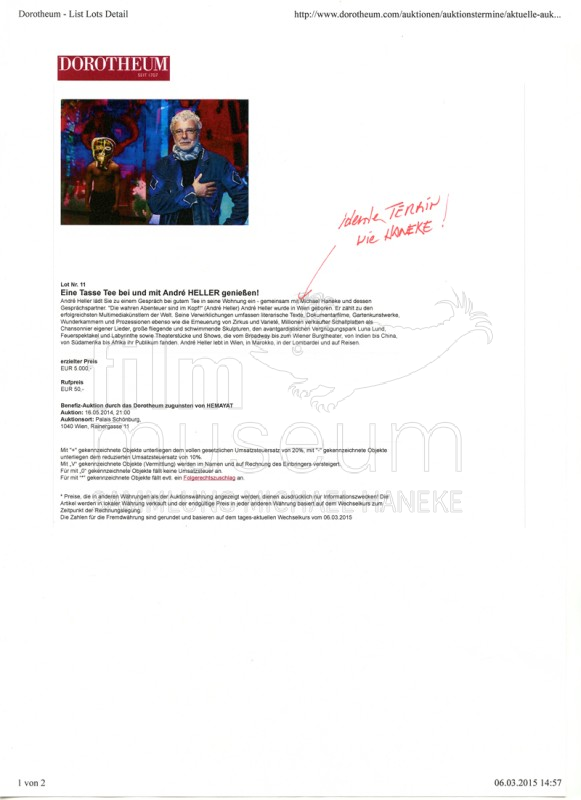 | Contains: | 2 Internet-Ausdrucke; Informationen zur Benefiz-Auktion zugunsten von "Hemayat", die am 16.5.2014 im Dorotheum Wien stattfand. Zu ersteigern war u.a. ein "Meet and Greet" (gemeinsamer Abend) mit Michael Haneke und André Heller |