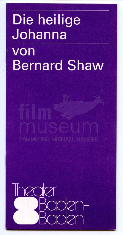 | Contains: | "Die heilige Johanna" nach George Bernhard Shaw, Inszenierung: Michael Haneke. Theater der Stadt Baden-Baden, Programmheft 11, Spielzeit 1973/74. Premiere: 15. März 1974 |