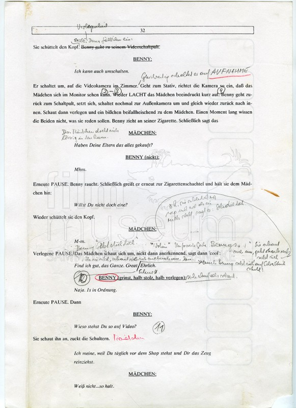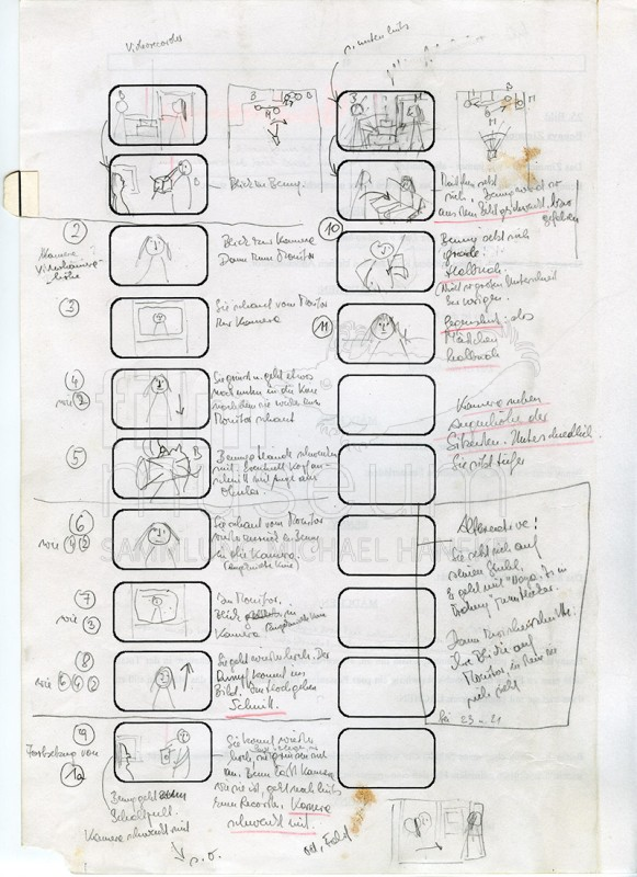 | Contains: | 1 Exemplar mit handschriftlichen Anmerkungen, Skizzen und eingefügten Fotos (Storyboard), 1 Mappe mit Szenenaufteilung |