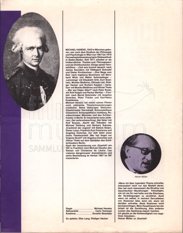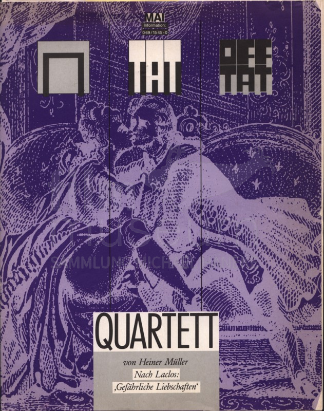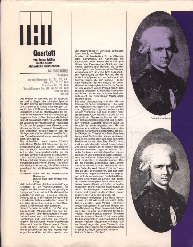 | Contains: | Spielplan Mai 1987, 1 Exemplar, Heiner Müllers "Quartett" in der Inszenierung von Michael Haneke. Premiere: 27. Mai 1987 |