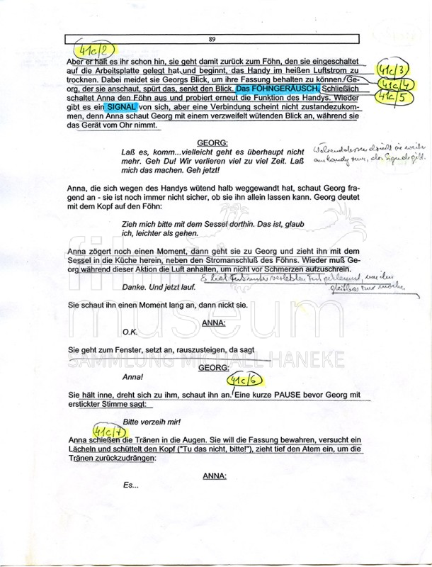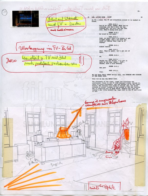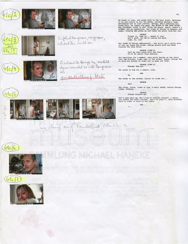 | Contains: | Regiedrehbuch (dt./engl.) mit Notizen, Videostills (mit Timecode), Skizzen |