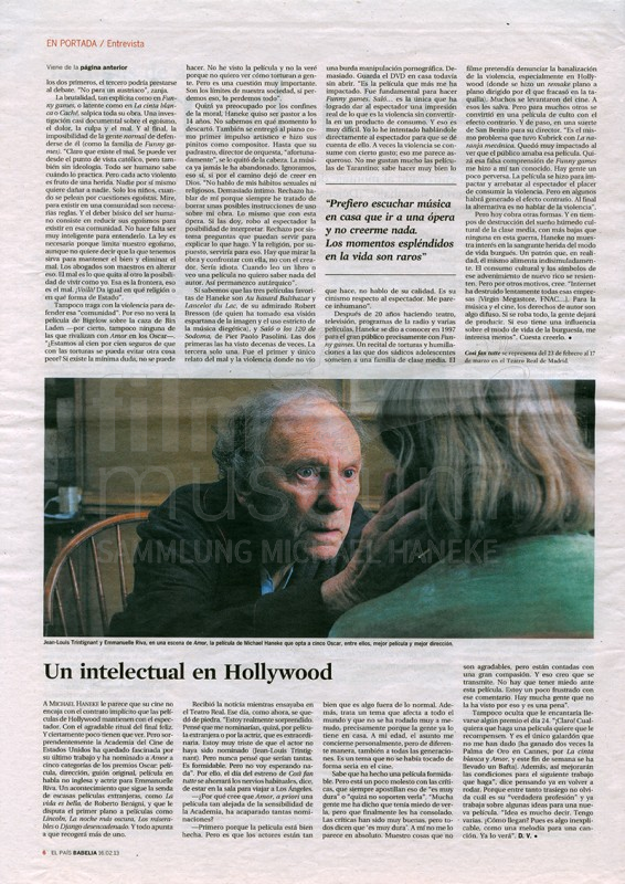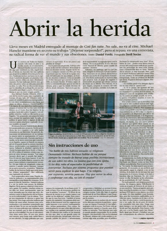 | enthält: | Kulturbeilage der spanischen Tageszeitung: Interview mit Michael Haneke, v.a. über seine "Cosi fan tutte"-Inszenierung an der Madrider Oper ("Abrir la herida" von Daniel Verdù, S. 4-6) sowie ein Artikel über Michael Haneke und "Amour" ("Un intelectual en Hollywood, von Daniel Verdú, S. 6) |
